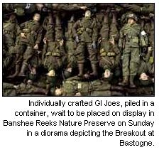 Boswell, manager of the Potomac Lakes Sportsplex, brought close to 200 figures GI Joes to set up Easy Company (from Band of Brothers), complete with tanks, jeeps, MPs on motorcycles and anti-tank guns, on a sweeping slope leading to the battered remains of the village of Bastogne. Only the green grass and humming cicadas violated the simulation. December 1944 was the coldest winter in 100 years in the Ardennes. The battle took place in several feet of snow, and troops struggled with wind-chill temperatures well below zero. |