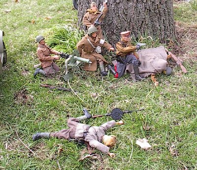 | The Russian squad opens fire, with small arms, their heavy machine gun,